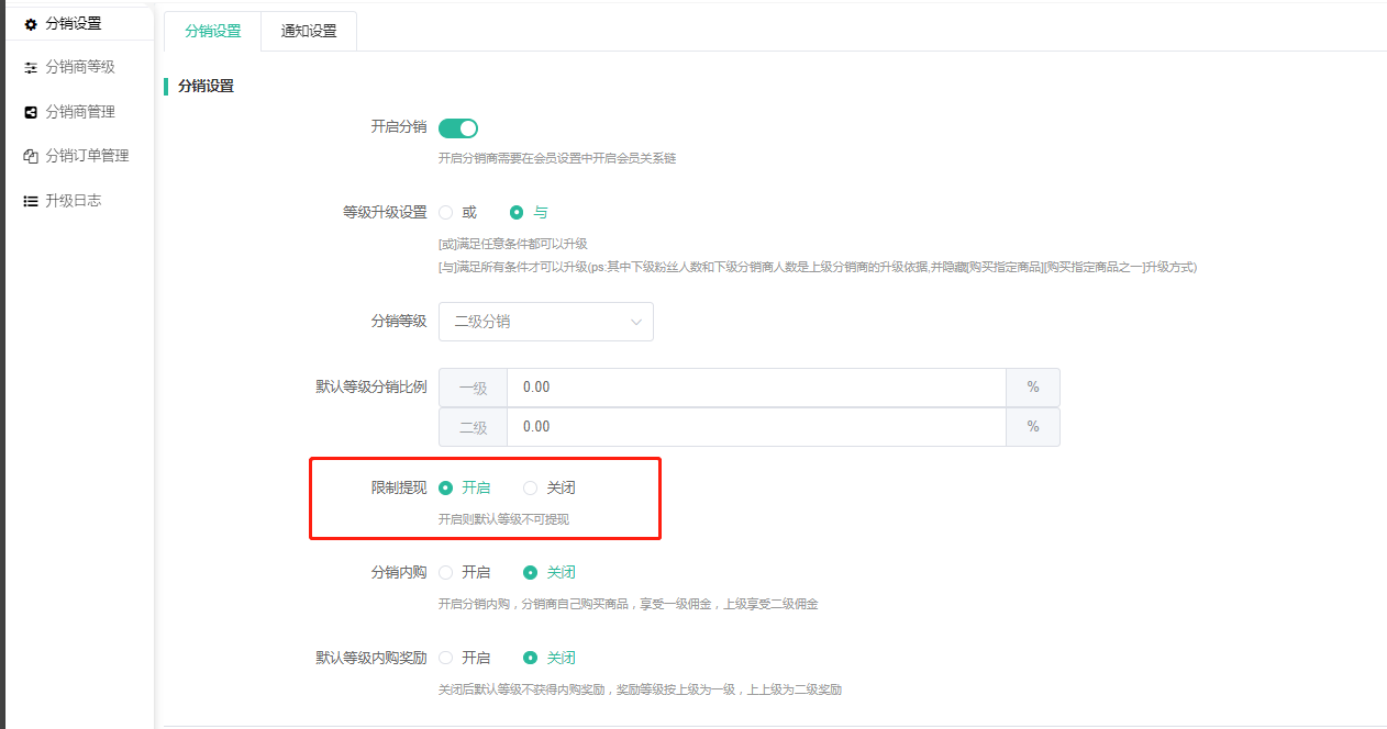 限制提现:开启限制提现,默认等级分销商则不可操作所有收入提现申请,开启后前端申请时会显示:不满足分销商等级,不可提现。