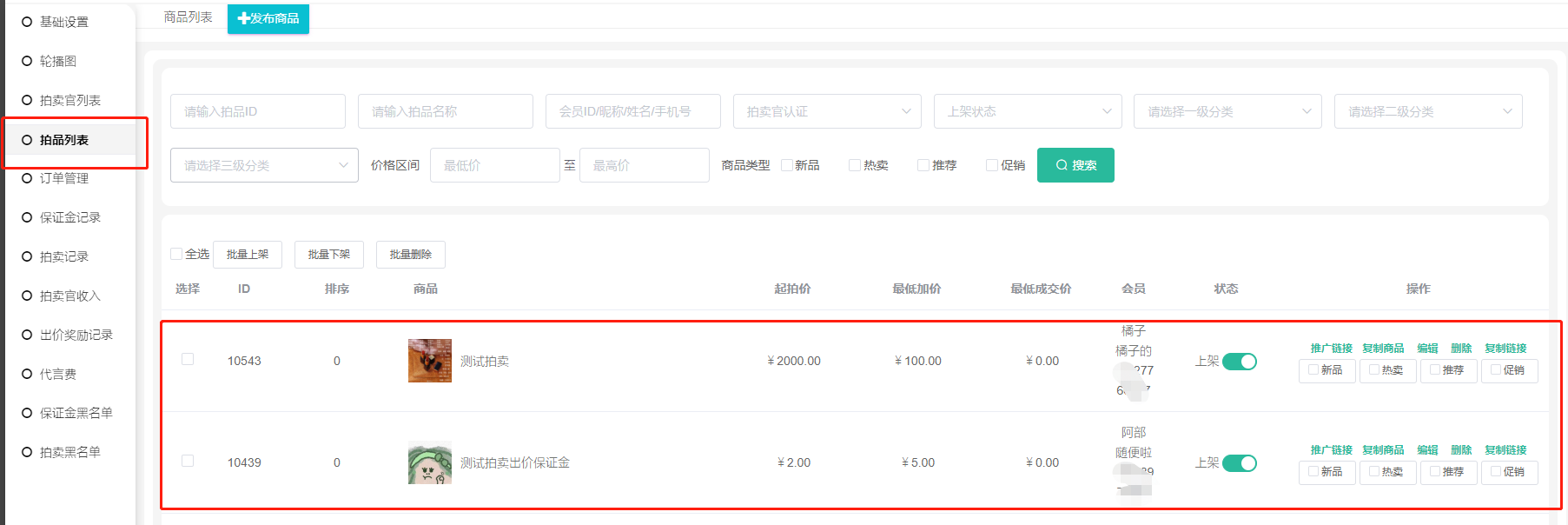 2、可以按拍品ID(拍品ID搜索框可按商品名称搜索商品 )、会员ID昵称/姓名/手机号、拍卖官认证、上架状态、商品分类、价格区间、商品类型,搜索查看商品;