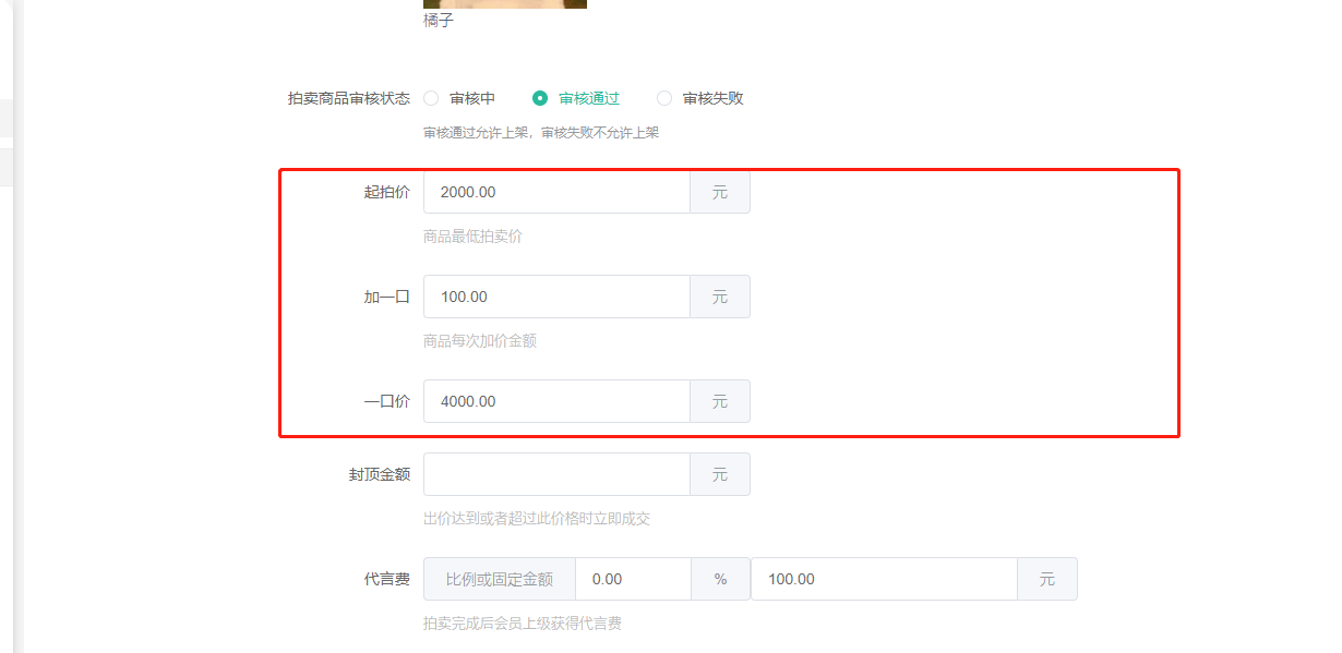 8、代言费,自定义比例或固定金额,竞拍成功的会员上级获得代言费,成交价*自定义比例